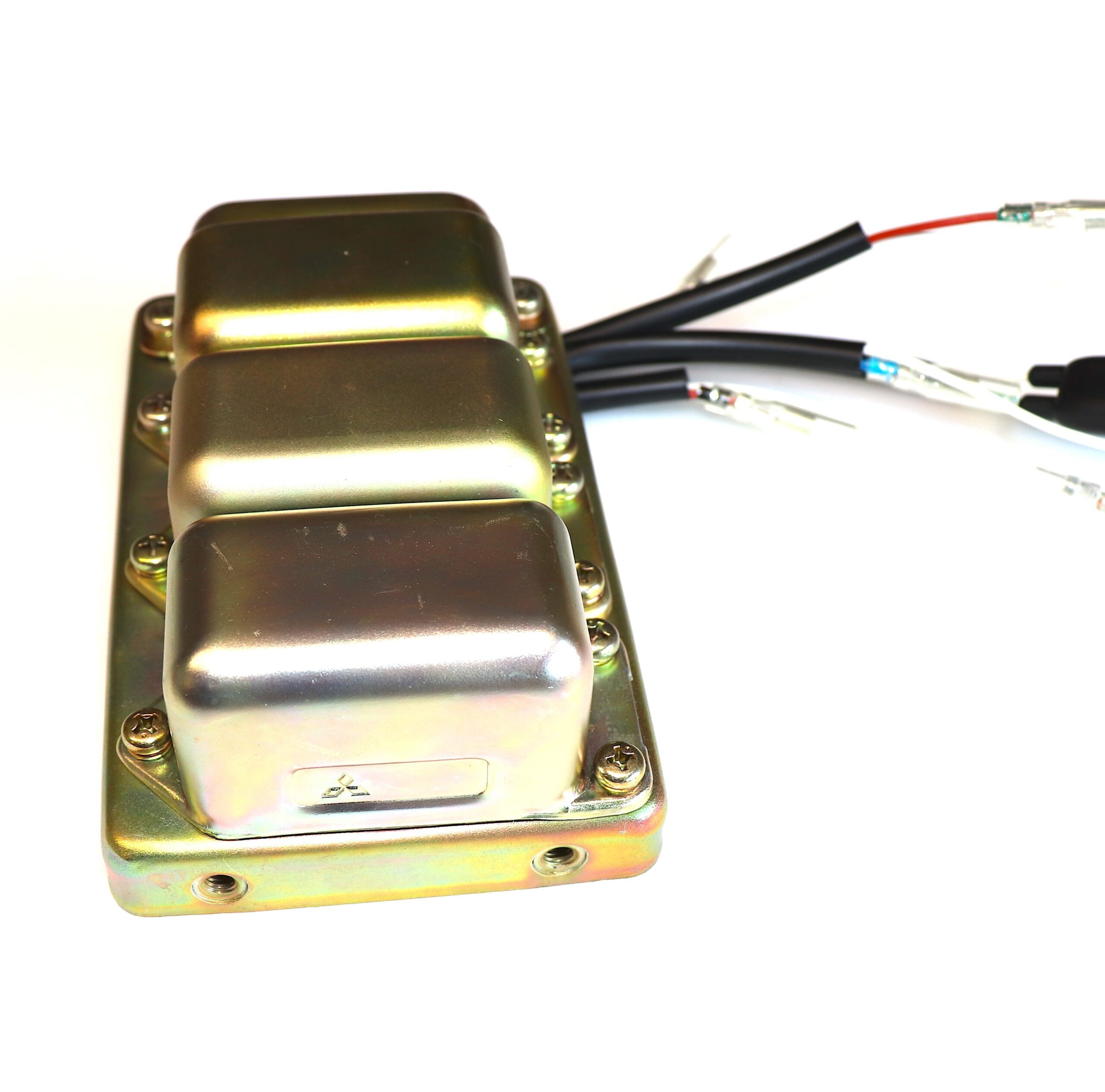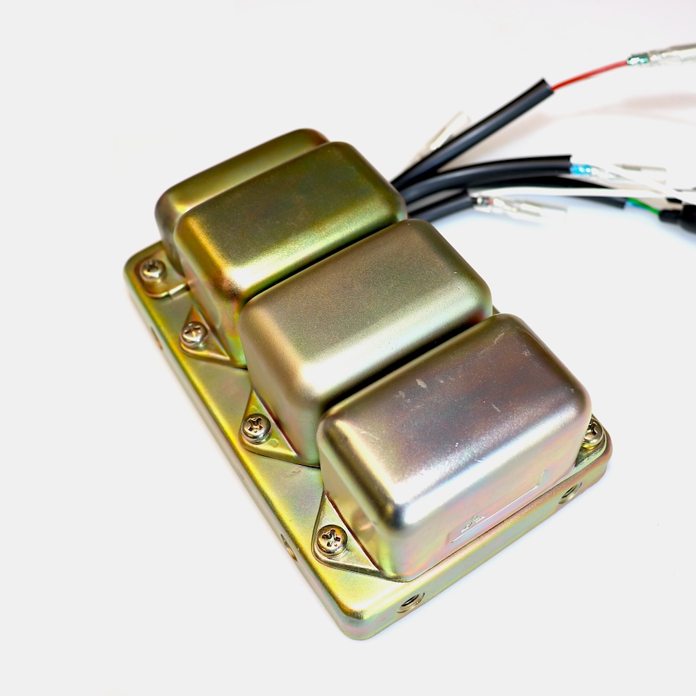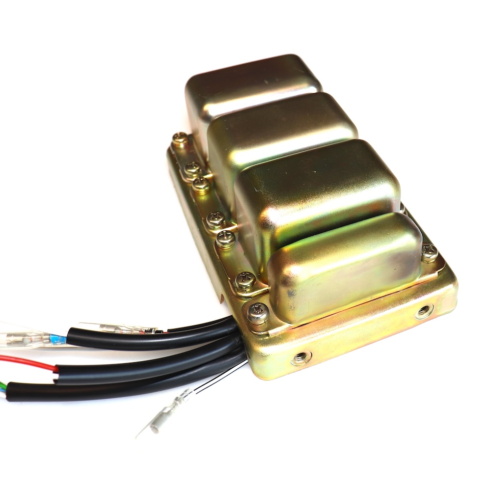 Lot 00304 – A clean, well restored Kawasaki H2 B/C triple ignition unit, with just a few minor age related marks visable. The CDI unit in the ‘L’ postion has a tiny but noticeable indentation on the upper surfave which is visable when installed. Ready to go on an exchange basis. This is a genuine OEM part, fully rebuilt in-house with brand-new modern electronics sealed inside its original case.